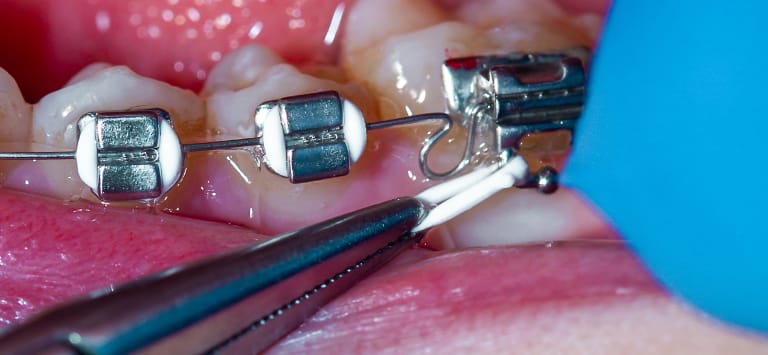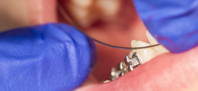 After the brackets are in place, it's time to attach the arch wire across the brackets. The arch wire is what exerts gentle pressure on the teeth to move them into the correct position. Once the arch wire is in place, we attach small elastics, called ligatures, to hold the arch wire in place.